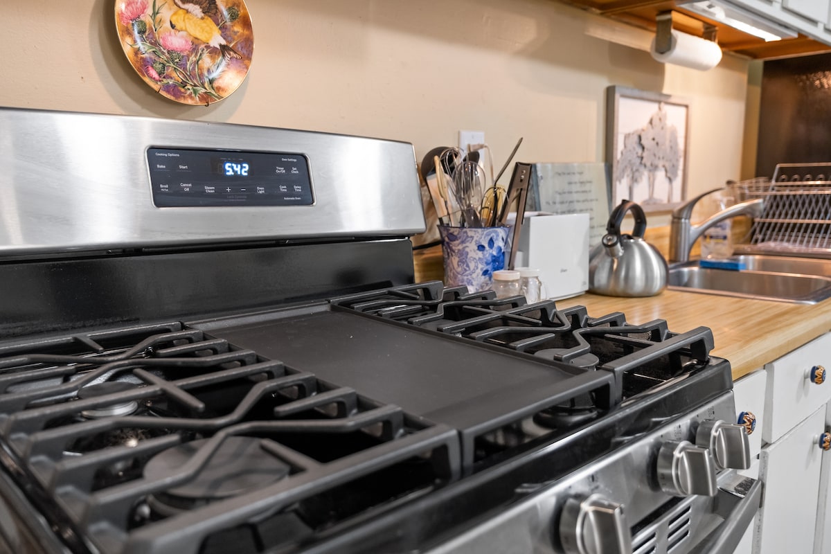 Fully equipped with a full-sized refrigerator, oven, stove, microwave, toaster, and all the basic kitchen essentials; Pots/Pans/Plates/Cups/Utensils/spices/Foil.